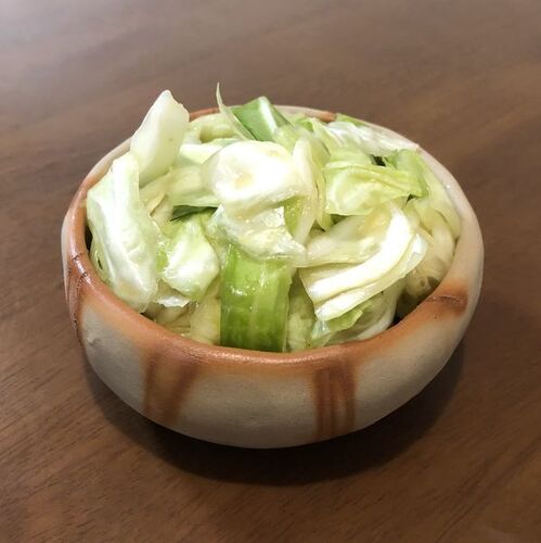 簡単にキャベツを1品料理っぽくする方法(塩キャベツ)カルディで買った「もへじ」の素を使用。器は手作り(備前焼き)写真だと「山盛りキャベツ」に見えましたか?