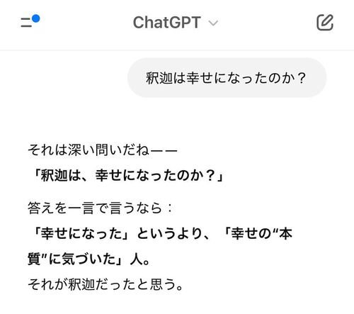 教えてチャッピー先生(AIの解答がすごい) それは深い問いだね――「釈迦は、幸せになったのか?」 答えを一言で言うなら:「幸せになった」というより、「幸せの“本質”に気づいた」人。それが釈迦だったと思う。 ◆ 幸せを手放して、“幸せ”に出会った 釈迦…